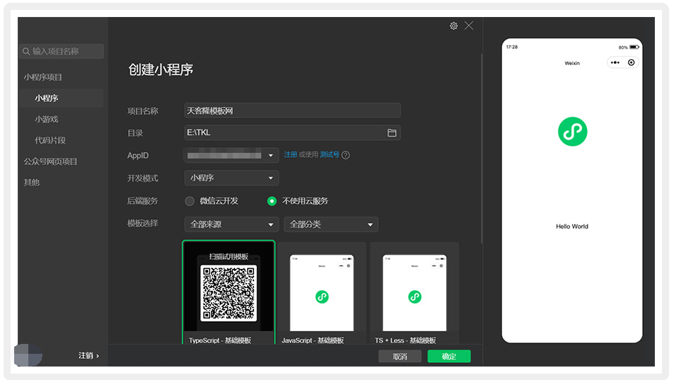 打开微信开发者工具,创建小程序,填写项目名称、选择目录、小程序的AppID、不使用云服务,点击确定。